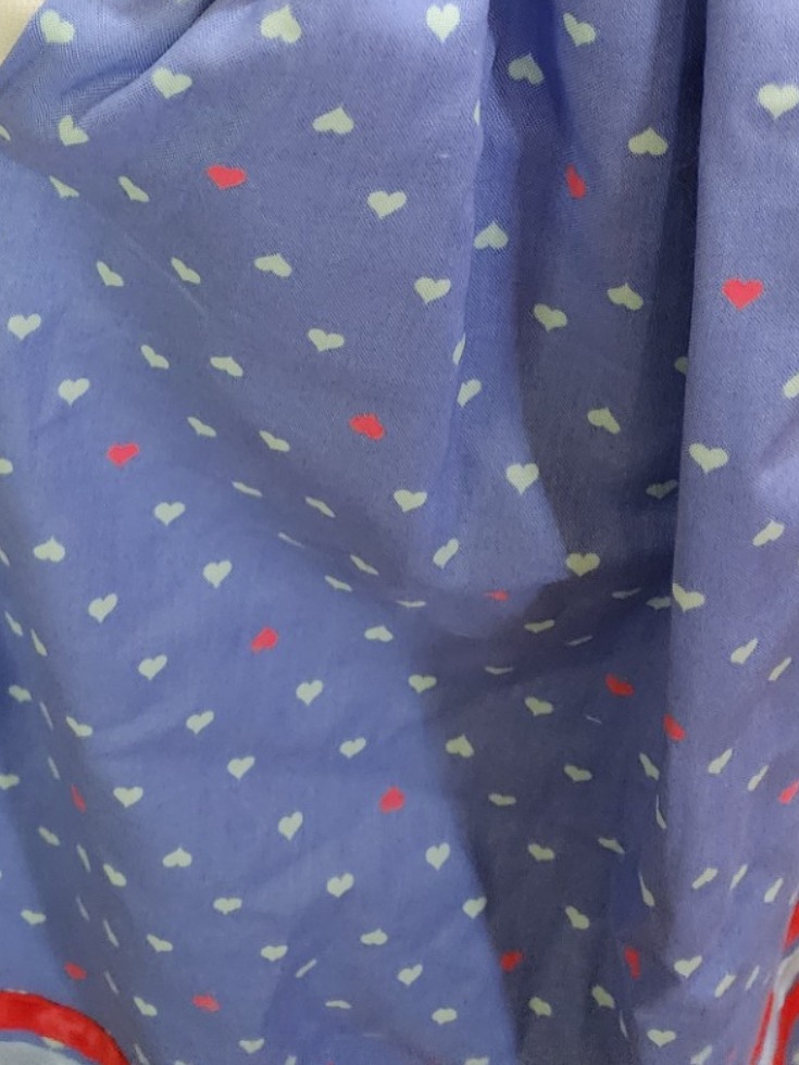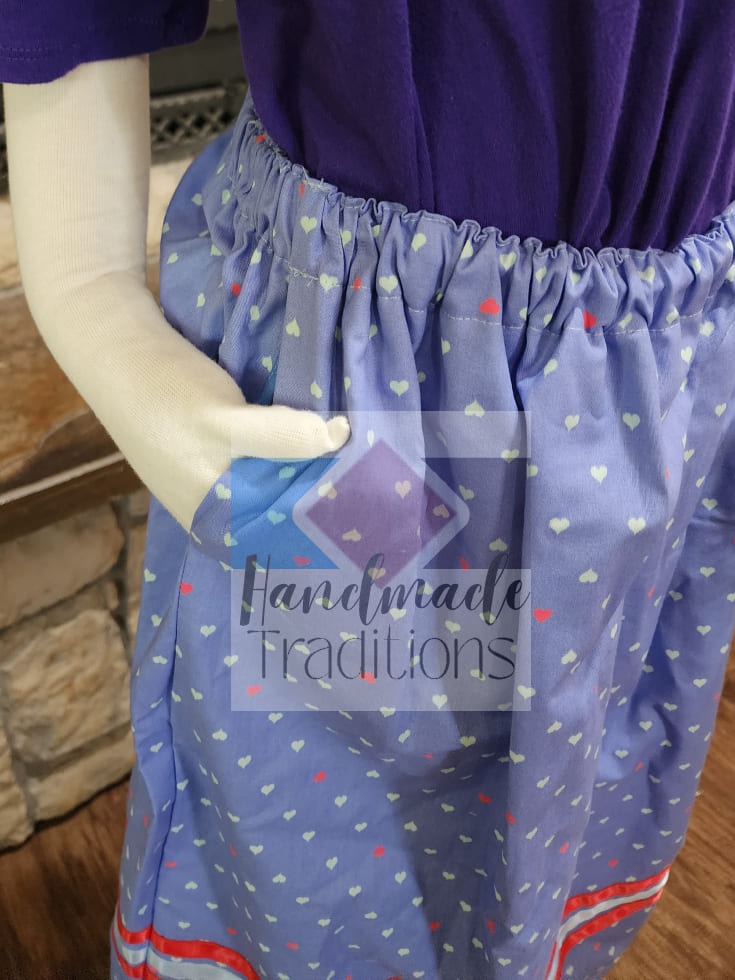 Girl’s Ribbon Skirt White and red hearts on a blue background with red and blue ribbons 2 Side pockets. Waist 18"-36" length - 24.5" High quality 100% cotton woven fabric.